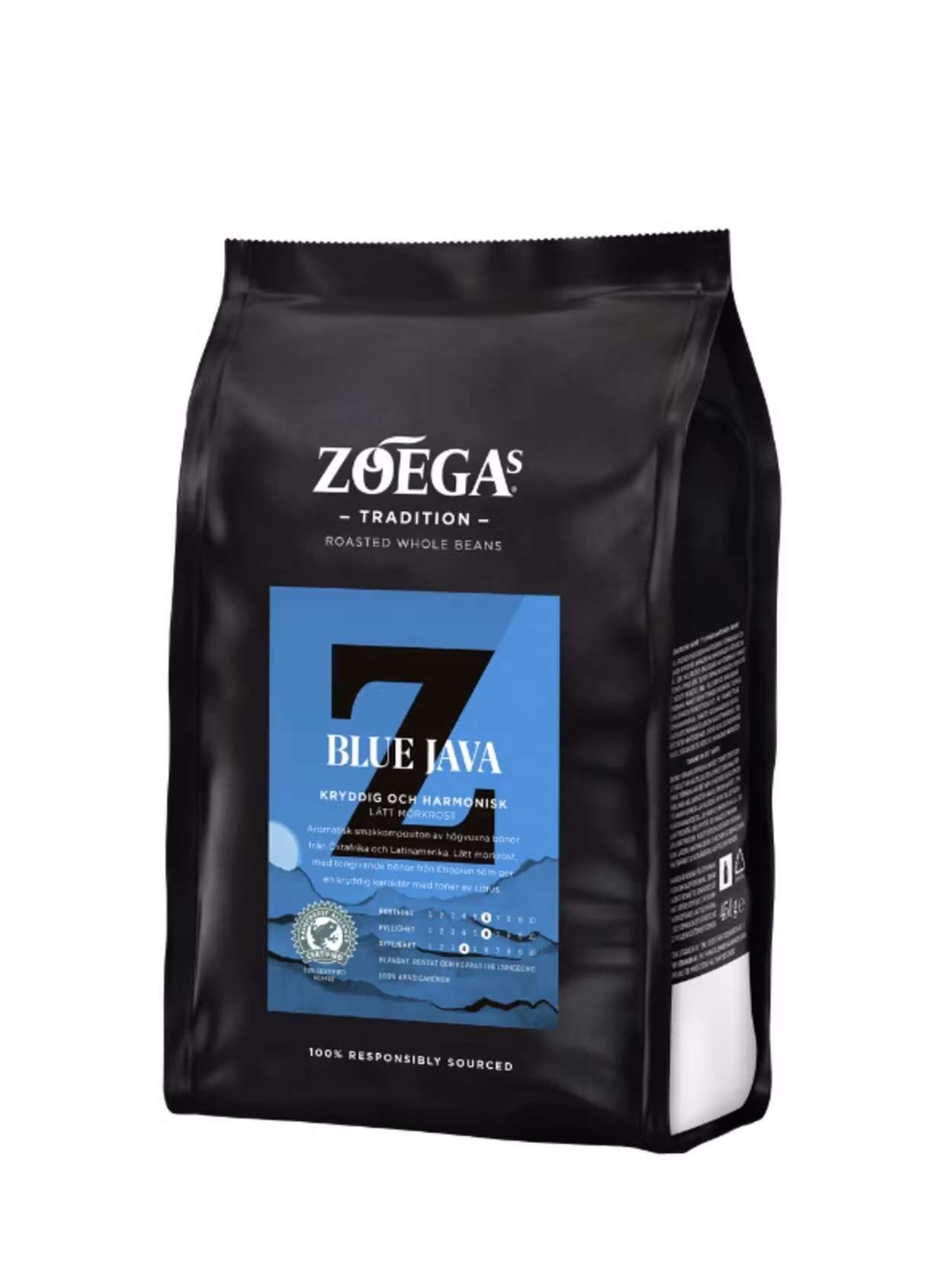 Zoégas är ett av Sveriges största kafferosterier. Med hjärtat i Skåne är detta ett av de mest folkkära kaffeproducenterna i landet. Utöver de välkända kaffesorterna som Skånerost och Mollbergs Blandning, har Zoégas en rad andra smaker, så som detta Blue Java kaffe.