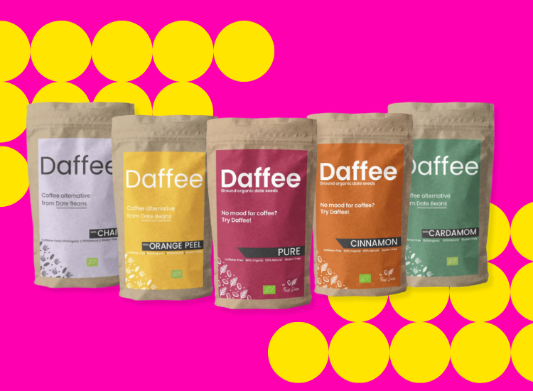 Daffee är ett innovativt företag från Amsterdam som gör en kaffeliknande dryck av ekologiska dadelkärnor. Inga bönor här alltså utan bara kärnorna från dadlar. Istället för att kasta dem, så rostar och maler man dem och vips – du har en mörk, mustig dryck som smakar förvånansvärt mycket som bryggkaffe! Det är dessutom packat med antioxidanter och protein för en naturlig energiboost.