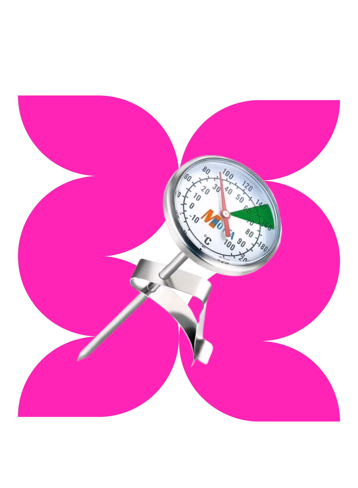 Termometern är utrustad med en smidig klämma som fästs direkt på kanten av mjölkkannan. Det gör att den sitter stabilt medan du värmer eller skummar mjölken och ger en snabb och tydlig temperaturavläsning under hela processen. För bästa resultat bör mjölken värmas till cirka 60–65 grader, vilket ger ett krämigt och sammetslent mjölkskum.